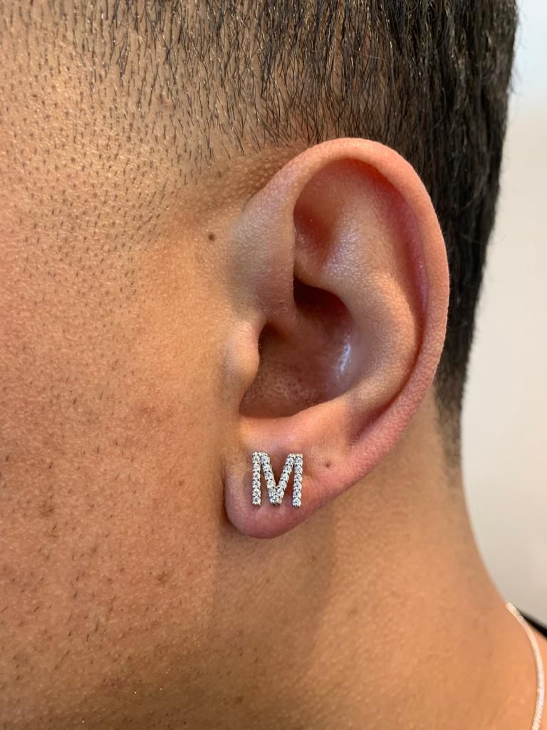 Brinco Masculino Par Letra M (7,8X7,8mm) Banhado A Ouro Branco