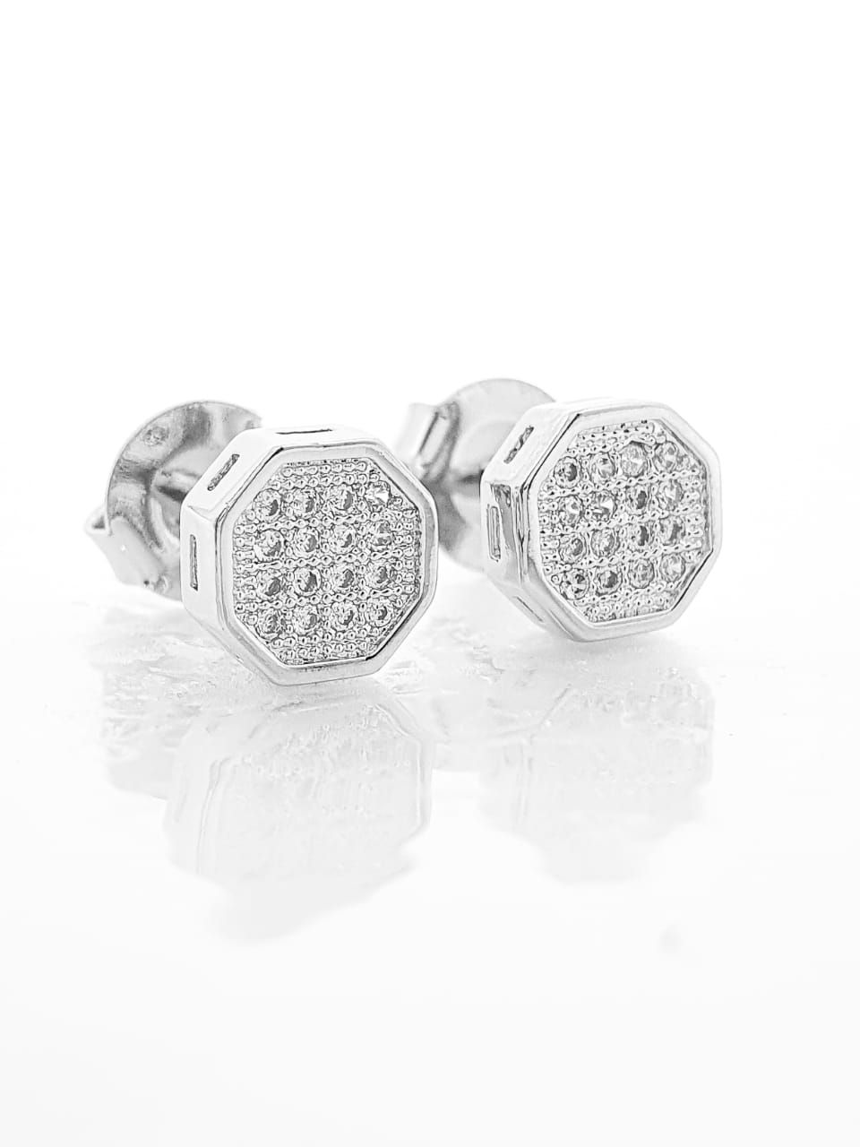 Brinco Masculino Par Octagonal Cravejado Com 16 Pedras (7,4X7,4mm) Banhado A Ouro Branco BRI105